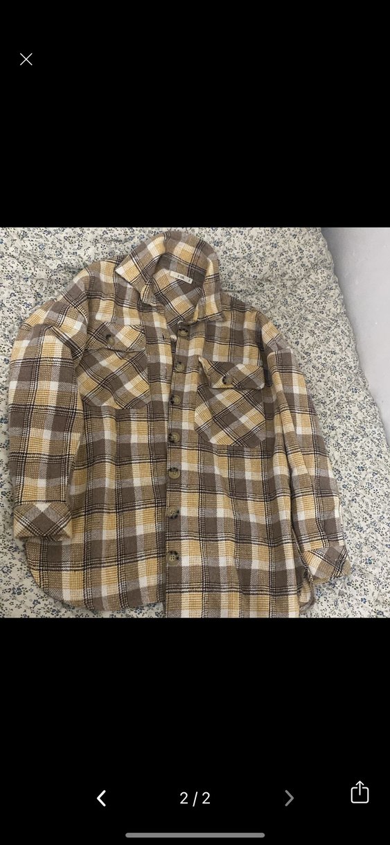 Düğmeli, uzun kollu ve notched lapel yakalı kadın gömlek. Yumuşak yün kumaştan, kahverengi ve gri ekose desenli, bol kesim. Günlük kullanıma uygun.
