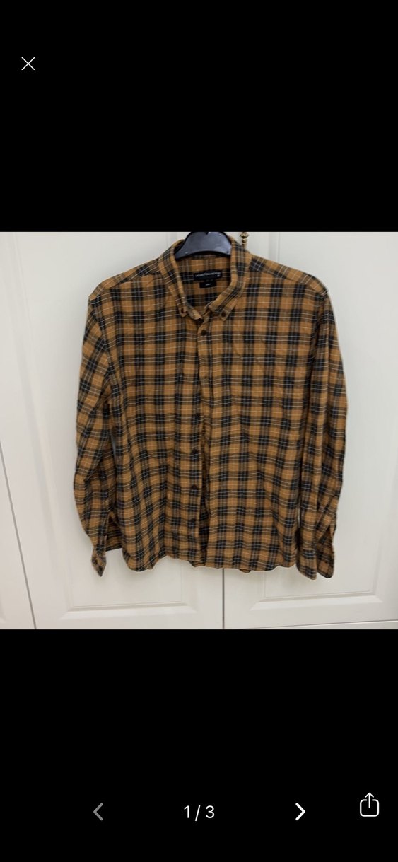 Düğmeli, uzun kollu, yakalı ve rahat kesimli kahverengi gömlek.