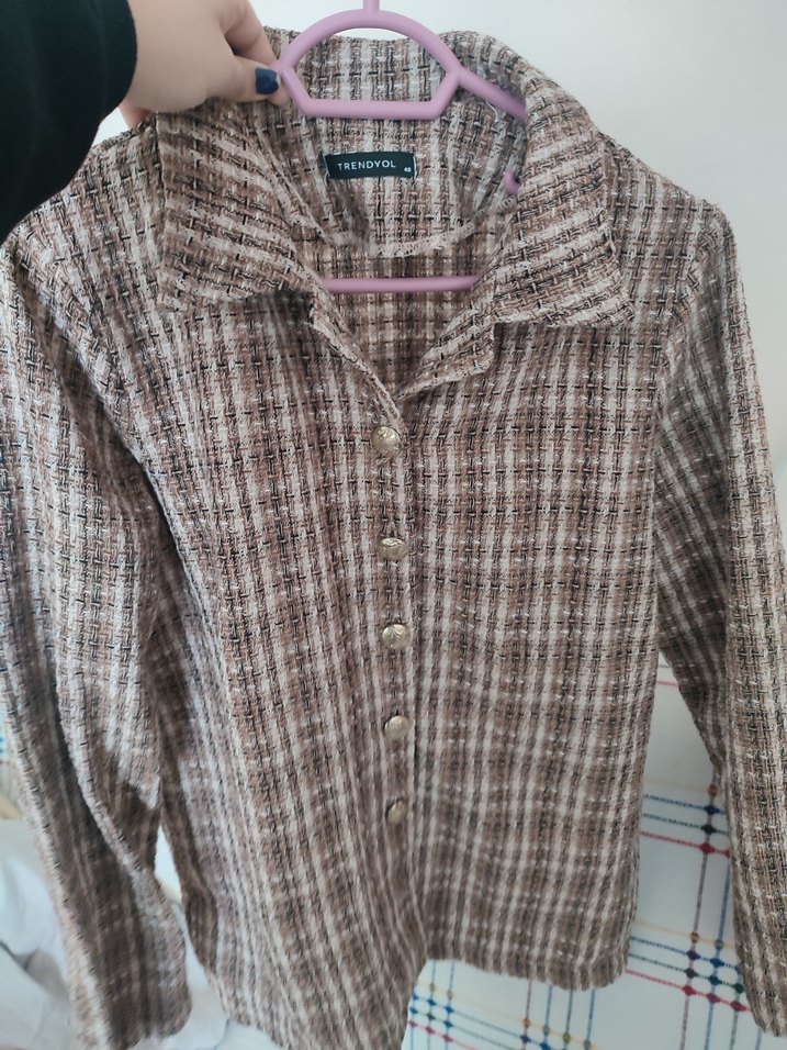 Düğmeli ön kısmı ve yakası bulunan, yumuşak sentetik kumaştan yapılmış, rahat kesime sahip kahverengi uzun kollu gömlek.