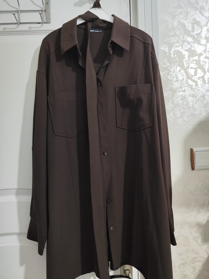 Uzun boylu ve bol kesim kahverengi kadın gömlek, düğmeli ön ve kesik yaka detaylarına sahiptir. Ofis için uygun, ipeksi dokulu ve düzdür.
