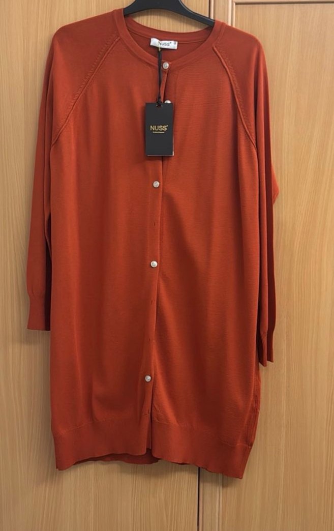 Kiremit, uzun kollu ve düğmeli bu uzun hırka, bol kesimi ve yuvarlak yaka detayıyla sade ve normcore tarzda, günlük kullanım için uygundur.