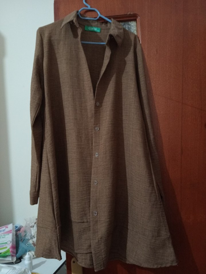 Keten kumaştan yapılmış, uzun kollu ve düğmeli, bol kesim kahverengi kadın gömlek. Notch yakalı ve desen içermeyen rahat bir tasarıma sahiptir.