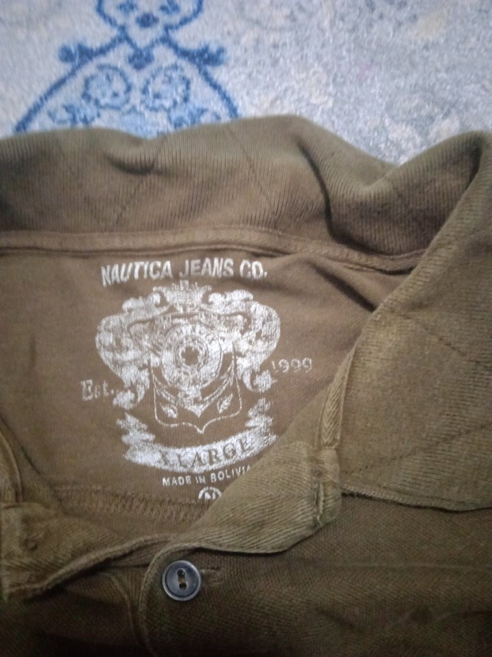 Pamuklu, baskılı vintage desenli, düğmeli, uzun kollu ve normal boy kahverengi fitted erkek polo tişört. Günlük kullanıma uygun normcore tarzda Nautica Jeans Co. markalı