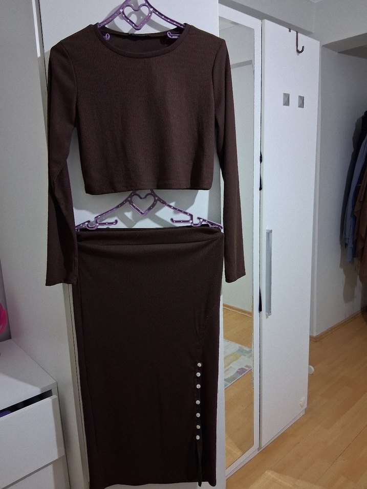 Düğmeli, uzun kollu, kahverengi triko crop- etek, dar kesim ve yuvarlak yakaya sahiptir. Günlük kullanıma uygundur. Takımdır. 1 kere giydim. esneklik payıda bulunmaktadır.ölçüler fotoğraflarda belirtilmiştir.