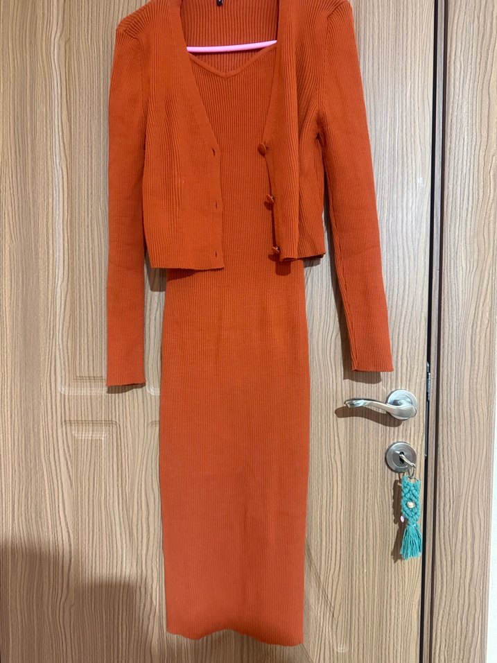 Uzun, kahverengi triko elbise, düğmeli ön kısmı ve notlu yaka detayına sahiptir. Yumuşak sentetik kumaştan üretilmiş, günlük kullanıma uygundur.