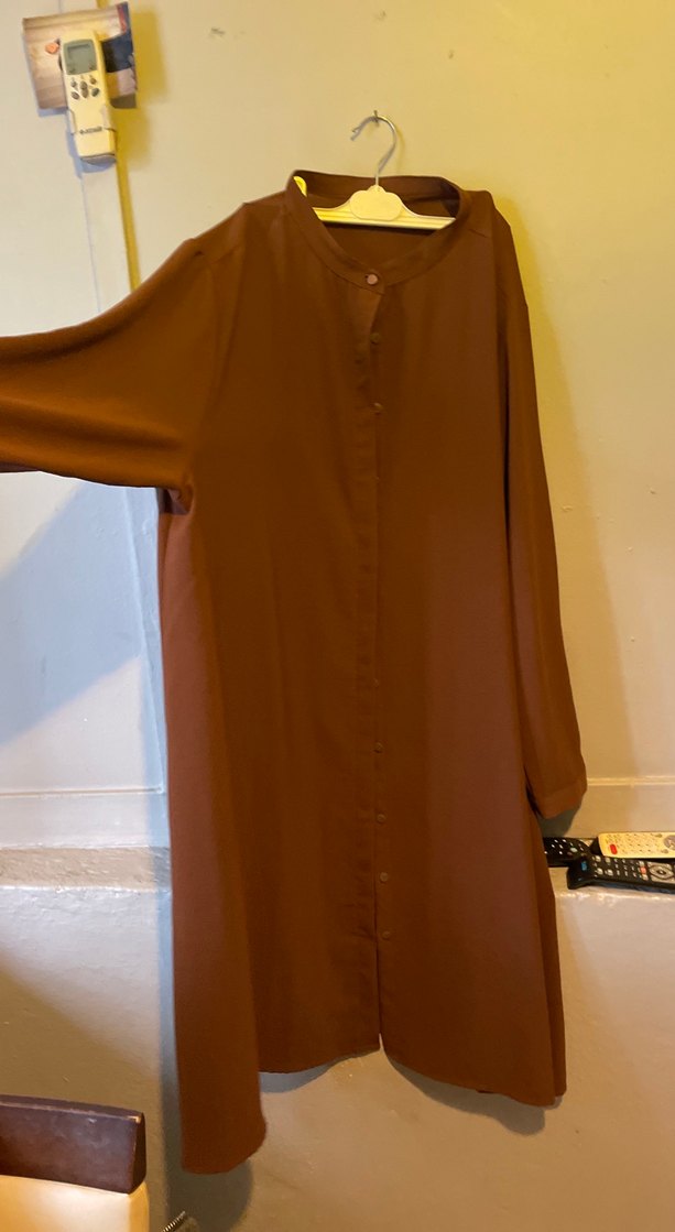 Koyu kahverengi, düğmeli uzun kollu, yüksek yakalı ve bol kesimli, yumuşak ipeksi kumaştan yapılmış minimalist deseniz tunik. Günlük kullanıma uygun, sade ve mütevazı tasarım.