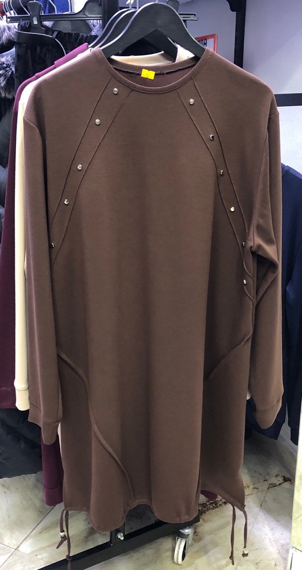 Düğmeli detaylara sahip, uzun kollu ve bisiklet yaka kahverengi bol kesim tunik. Yumuşak sentetik kumaştan üretilmiştir, günlük kullanıma uygundur.