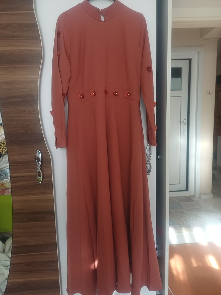 Kahverengi uzun elbise, düğmeli detaylara sahip, bol kesim ve uzun kolludur. Yuvarlak yaka ve minimalist tarzıyla günlük kullanıma uygundur.
