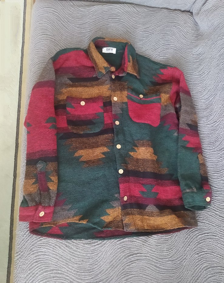 Düğmeli, uzun kollu kalın gömlek. Gevşek kesimi ve renkli deseniyle tarz
