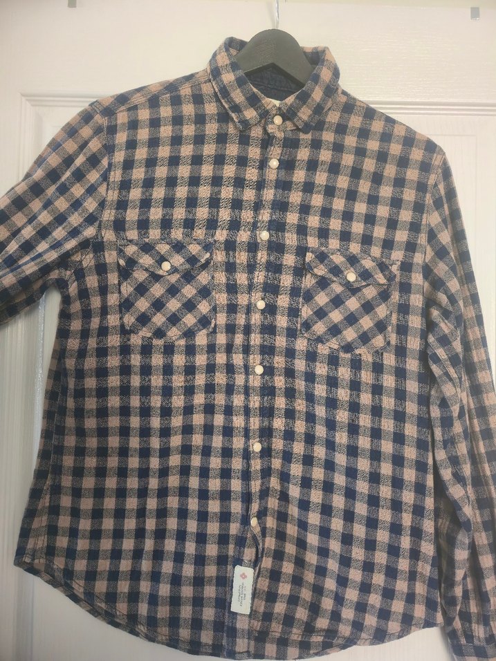 Düğmeli uzun kollu,bej ve koyu kareli desenli, bol kesim erkek gömleği. Tekstil kumaştan, günlük rahat sokak stili için uygundur.