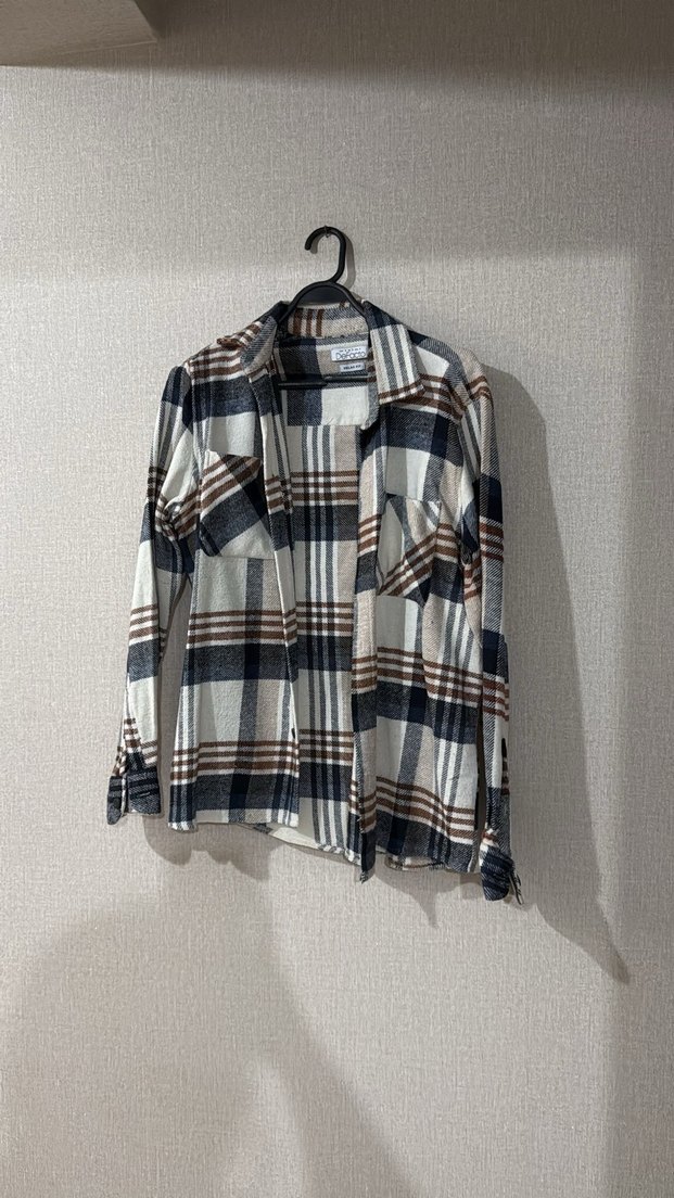 Düğmeli uzun kollu, bol kesim ve yakalı erkek gömlek. Yumuşak pamuk kumaştan yapılmış, kahverengi ve gri tonlarında kareli desene sahip, günlük kullanıma uygun.