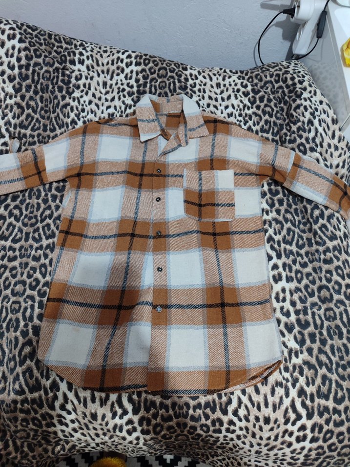 Bu kahverengi kareli kadın gömleği uzun kollu, yakalı ve bol kesimdir. Düğmeli önü ve göğüs cebine sahiptir, sentetik kumaştan üretilmiştir. Günlük kullanıma uygundur.