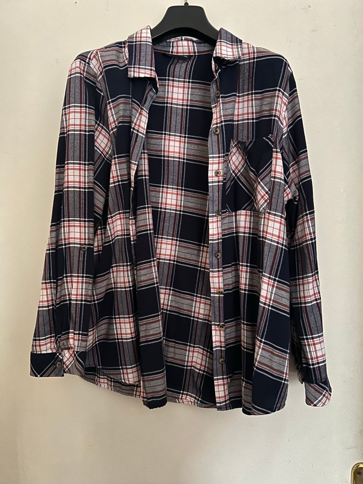 Pamuklu, düğmeli, uzun kollu, notalı yaka kadın gömleği. Koyu çok renkli kareli desene sahip, rahat kesim, günlük kullanıma uygun.