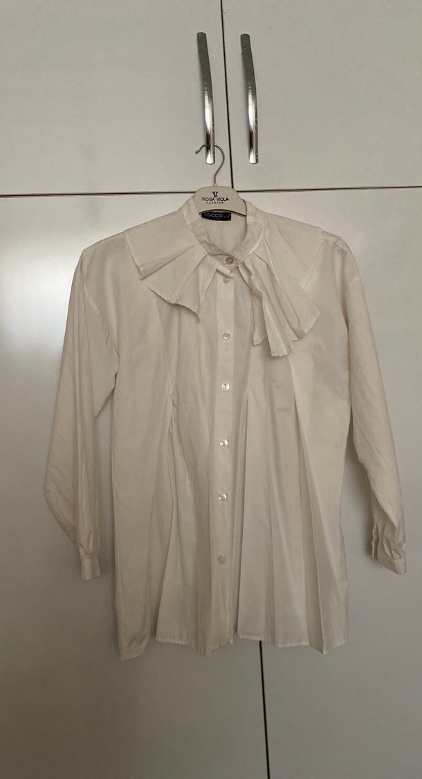 Düğmeli, yakalı, uzun kollu, keten kumaştan yapılmış beyaz gömlek. S\M beden hiç kullanılmamış