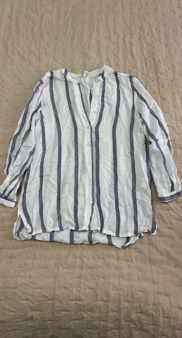 Düğmeli, yakalı, uzun kollu keten gömlek. Beyaz zemin üzerine gri dikey çizgilerle, bol kesim rahat kullanım sağlar.
