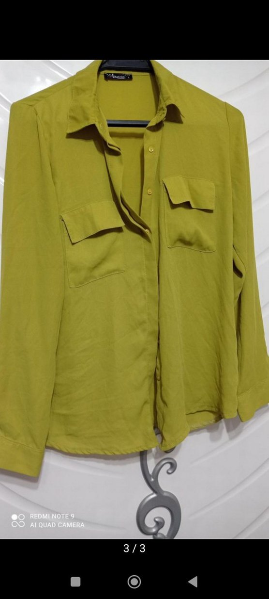 Düğmeli ön kısmı ve uzun kollu, bol kesim parlak keten kumaştan yapılmış haki kadın gömlek. Çentikli yaka ve iki göğüs cebi bulunur. Minimalist sokak tarzı için uygun.