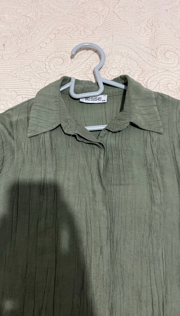 Düğmeli, uzun kollu, keten kumaştan yapılmış yeşil kadın gömleği. Salaş kesimi ve klasik yakasıyla günlük kullanıma uygundur.