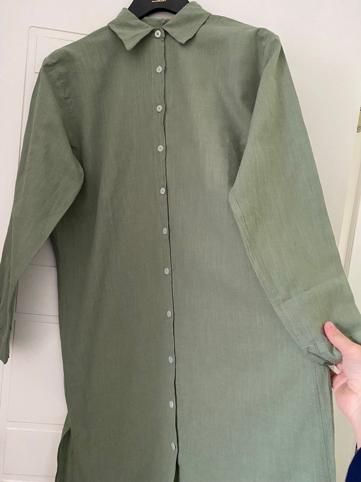 Düğmeli önü ve yakası güzel, keten kumaştan yapılmış, uzun kollu, rahat kesim, haki renk kadın gömleği.