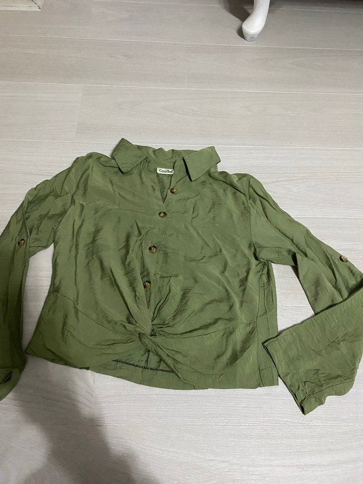 Düğmeli, yakalı, uzun kollu gömlek, bol kesim ve parlak haki renkte, günlük sokak stili için uygundur.