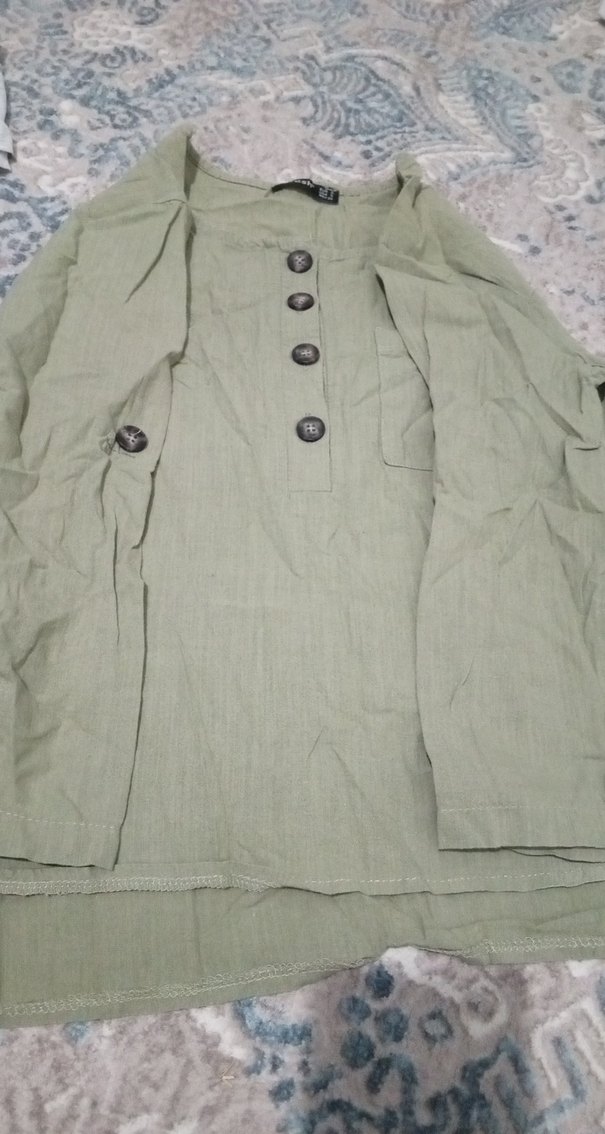Keten kumaştan, düğmeli ve uzun kollu, bol kesim, normal boy midi uzunluğunda, yakası kesimli, günlük kullanıma uygun khaki kadın gömleği.