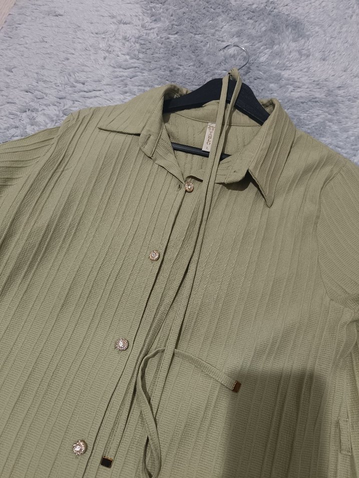 Kadınlara özel keten kumaştan, düğmeli ve yakalı uzun kollu gömlek. Khaki renkte, günlük kullanıma uygun rahat kesim.