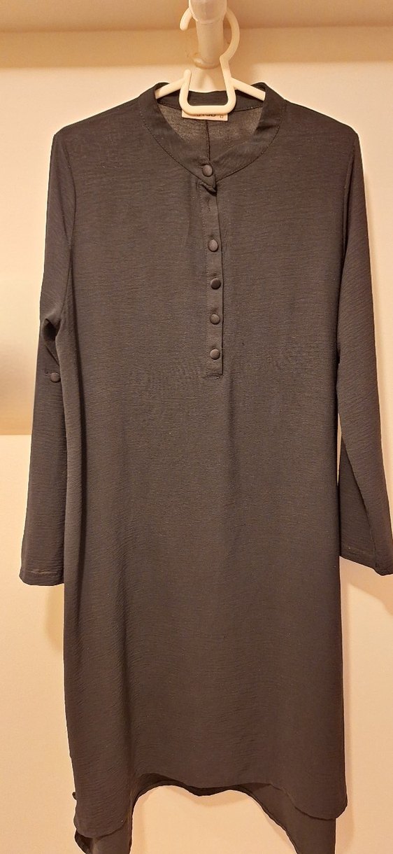 siyah ayrobin kumaştan, düğmeli ön ve yüksek yakalı, bol kesimli rahat bir uzun kollu tunik.
