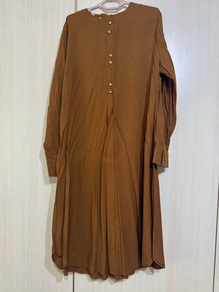 Keten kumaştan, düğmeli ve yuvarlak yakalı, uzun kollu ve bol kesim koyu bej tunik. Minimalist ve mütevazı stil için uygundur.
