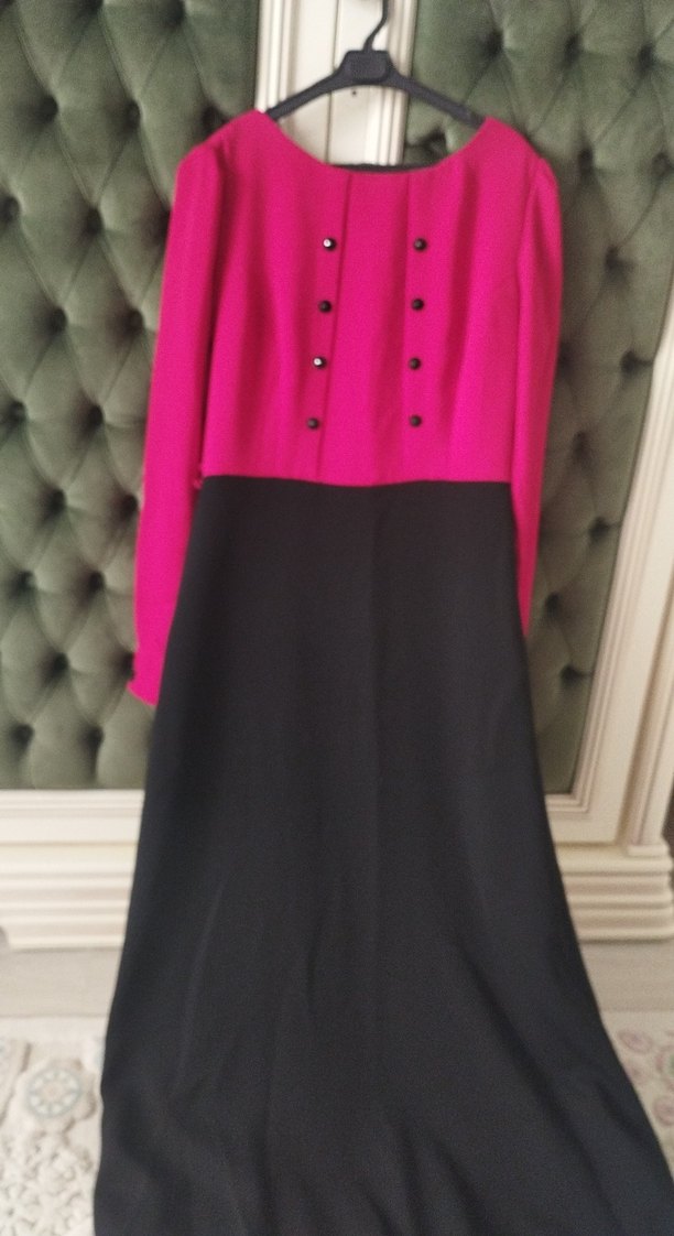 Uzun kollu, düğmeli, koyu kırmızı üst ve siyah etekten oluşan uzun elbise. Notlu yaka ve regular kesim ile ofis kullanımı için uygundur.