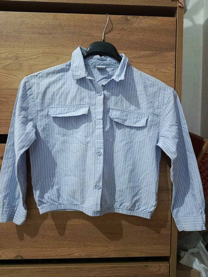 Düğmeli, uzun kollu ve yakalı gömlek. Yumuşak keten kumaştan, açık mavi ve ince çizgili. Günlük kullanıma uygun rahat kesim gömlek.
