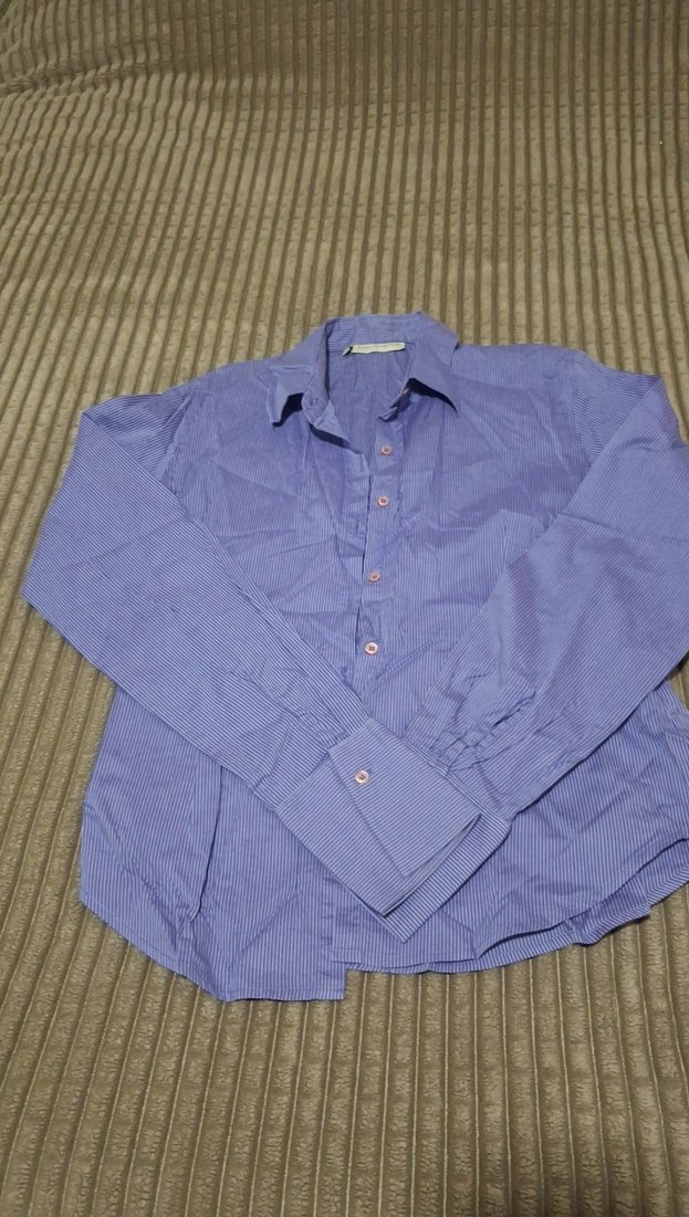 Pastel mavi keten kumaştan, yakalı, uzun kollu ve düğmeli ön kısmı olan, ofis kullanımı için uygun normal kesim gömlek.