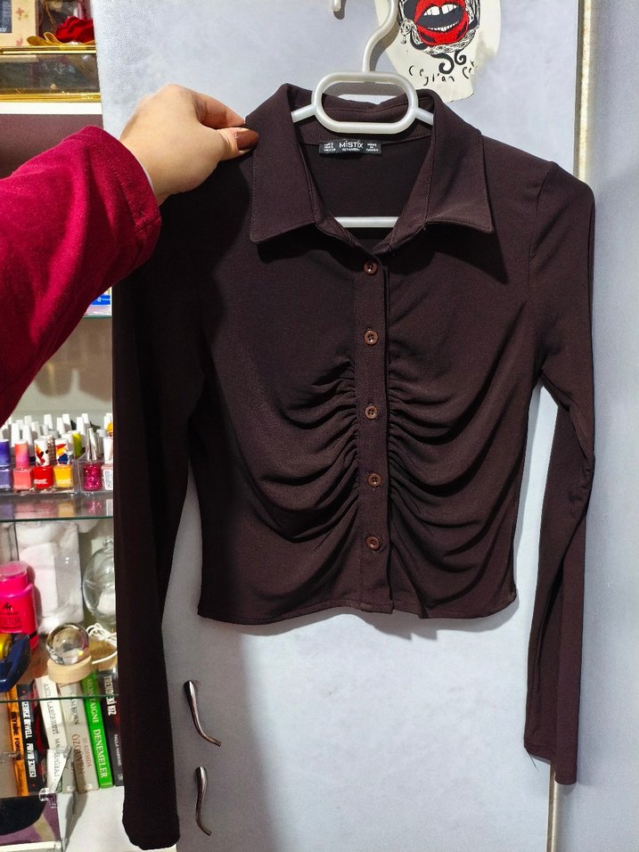 Düğmeli ve yakalı, uzun kollu dar kesim kadın bluz. Koyu kahverengi, yumuşak sentetik kumaştan günlük rahat stil için uygun. Small beden.