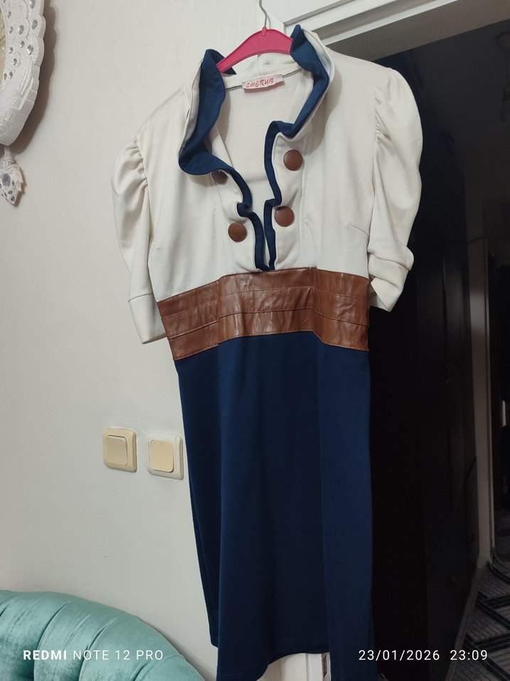 Düğmeli, uzun kollu, notched lapel yakalı kadın elbise. Sentetik kumaştan, regular fit ve koyu mavi ile kahverengi renk bloklu tasarıma sahip. Günlük kullanım için uygundur.