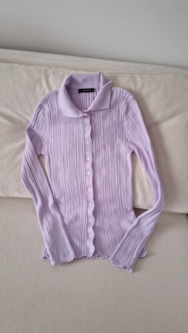 Düğmeli, uzun kollu, yakalı ve ince kesim lila renkli kadın trikosudur. Yumuşak keten kumaştan üretilmiş, günlük kullanıma uygundur.