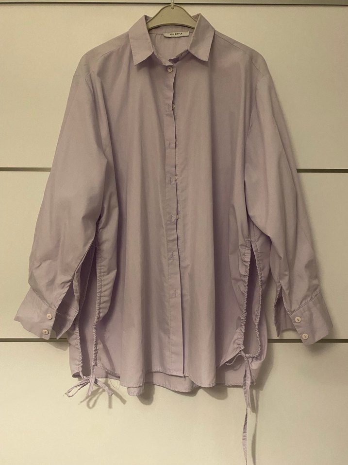Düğmeli, uzun kollu lila keten gömlek. Yanlarda bağcık detayları ve midi boyda, rahat kesimiyle günlük sokak stiline uygun. Bi düğmesi eksik fotoda mevcut