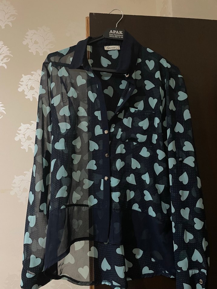 Düğmeli, uzun kollu ve yakalı bu kadın gömlek, sentetik kumaştan üretilmiş ve koyu mavi üzerinde kalp desenlerine sahip. Rahat kesimiyle günlük sokak stiline uygundur.