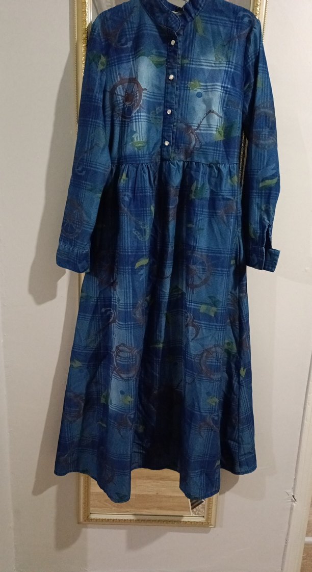 Düğmeli, uzun kollu, yakalı ve bol kesim bu elbise, koyu mavi batik desenli denim kumaştan yapılmıştır. Bohem tarzına uygundur.