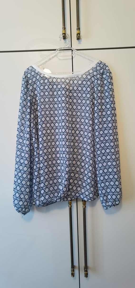 Düğmeli, uzun kollu ve tek renkli geometrik desenli mavi bluz. Yumuşak sentetik kumaştan, rahat ve bohem tarzda günlük kullanım için uygundur. Tamamı tüldür.