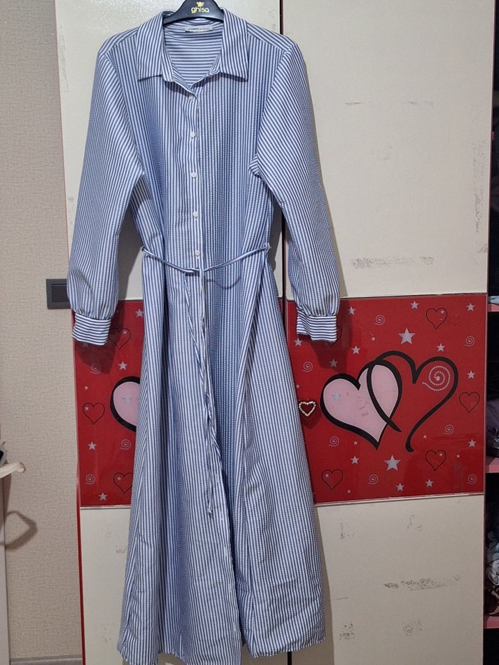 Düğmeli, uzun kollu mavi çizgili elbise, çıtmalı yakaya ve rahat kesime sahiptir. Sentetik kumaştan yapılmış, günlük kullanım için uygun trend sokak stili Parisian tarzı sunar. Oldukça iyi durumdadır. Sadece 2 kere giyildi. Kesimi oversize 46-48 bedene kadar rahatlıkla kullanabilirsiniz. Boydan boya düğmelidir. Benim boyum 162 bileğime kadar rahatlıkla geliyor. Tesettüre uygundur. Ürünün etiket fiyatı 600 tl.