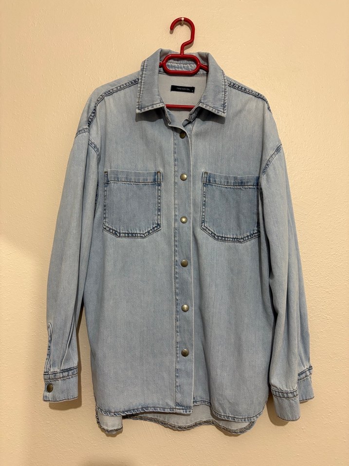 Mavi renk, düğmeli, uzun kollu, bol kesim denim ceket. Günlük kullanım için uygun, sokak modasına uygun tarzda. S beden oversize model