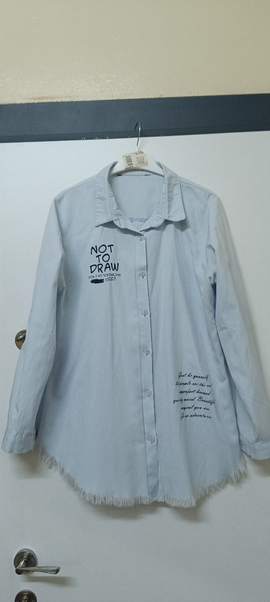 Pastel mavi renkli, düğmeli, uzun kollu denim gömlek. Notlu yakalı ve bol kesim, baskılı detaylarla günlük sokak stiline uygun.