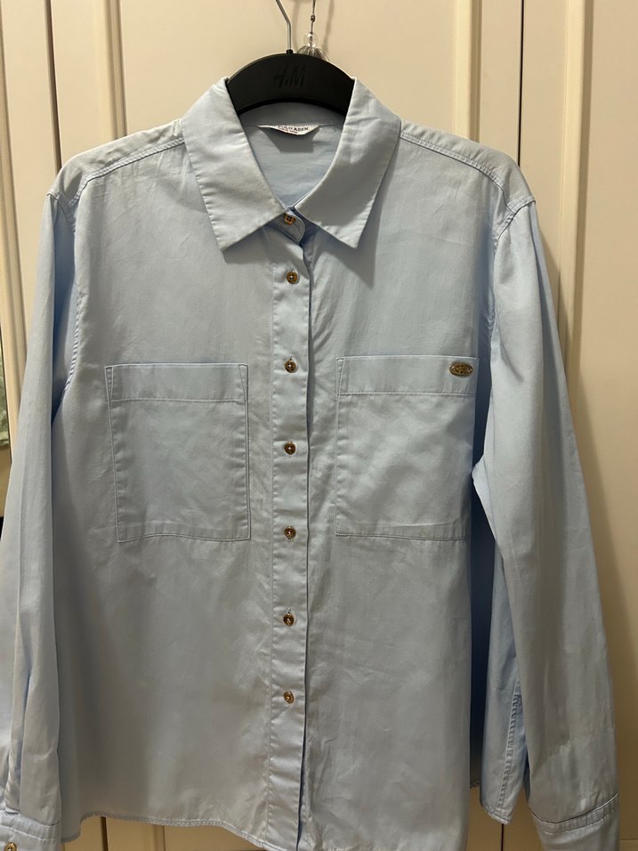 Uzun kollu, yakalı ve düğmeli, bol kesim mavi denim kadın gömlek. Önünde iki cep vardır, günlük rahat kullanıma uygundur.