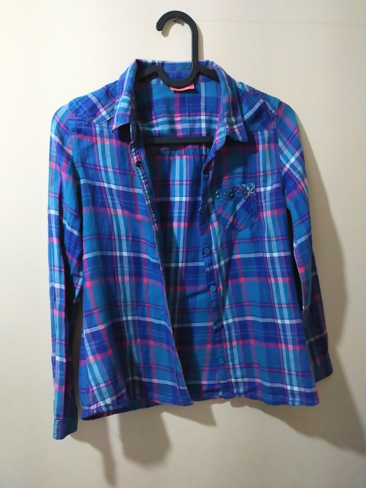 Düğmeli, yakalı, uzun kollu, bol kesim, renkli mavi ekose desenli gömlek, günlük rahat dış mekan kullanımı için uygundur.