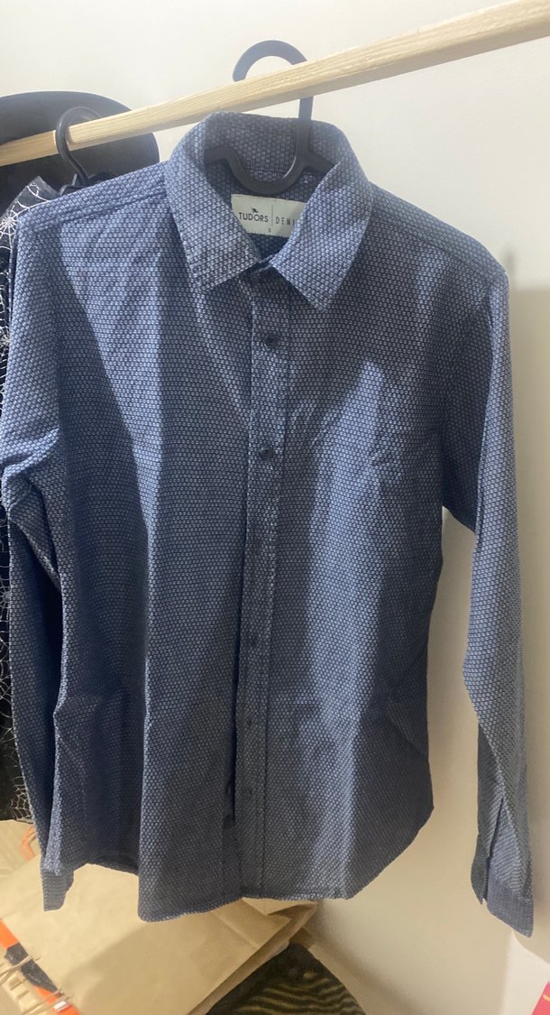 Düğmeli, uzun kollu, yakalı denim erkek gömleği. Normal kesim , gri-mavi renkte, desenli, günlük ve iş kombinlerine uygun. S beden