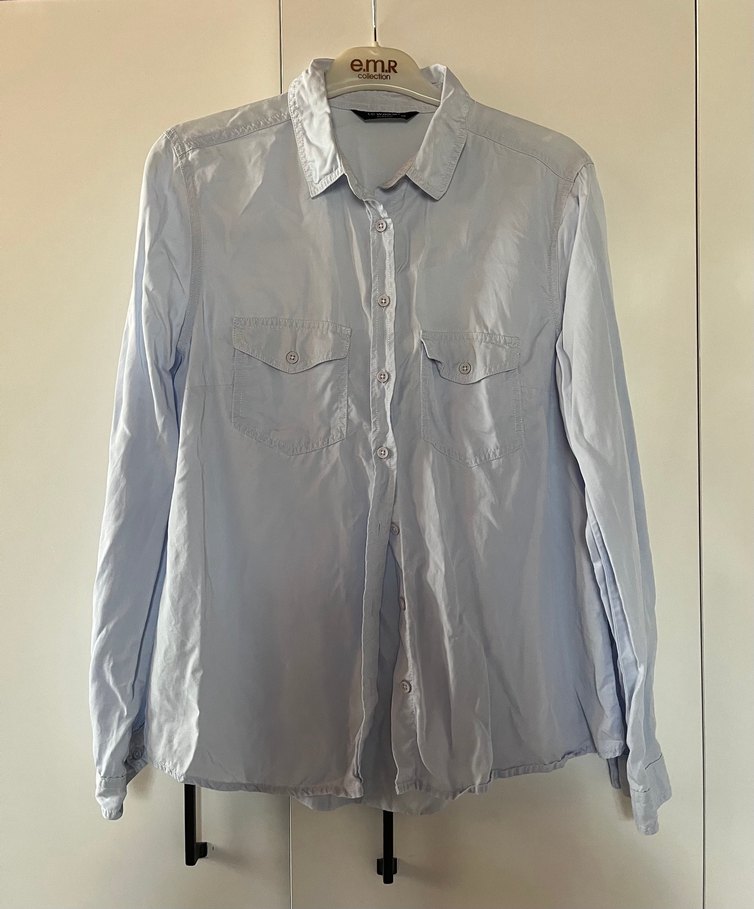 Yumuşak kumaştan, düğmeli ve uzun kollu, yakalı, rahat kesim mavi gömlek. Günlük kullanım için uygundur.