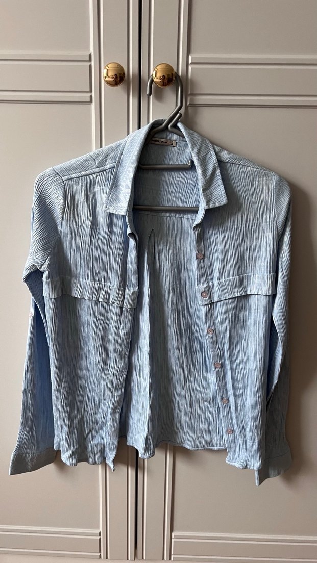 Düğmeli, uzun kollu, yakalı, bol kesim mavi gömlek, günlük rahat sokak stili için uygun. Utulenince yaka kismindaki desen ortaya cikar guzel duran bir gomlektir bana kucuk geliyor artik