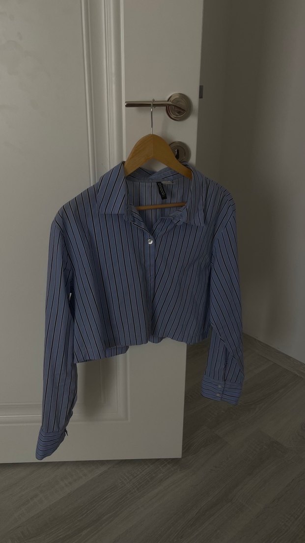 Mavi uzun kollu kadın gömlek, yakalı ve düğmeli önde. Bol kesim ve normal midi boyda, hafif çizgili desende, günlük rahat stil için uygundur.
