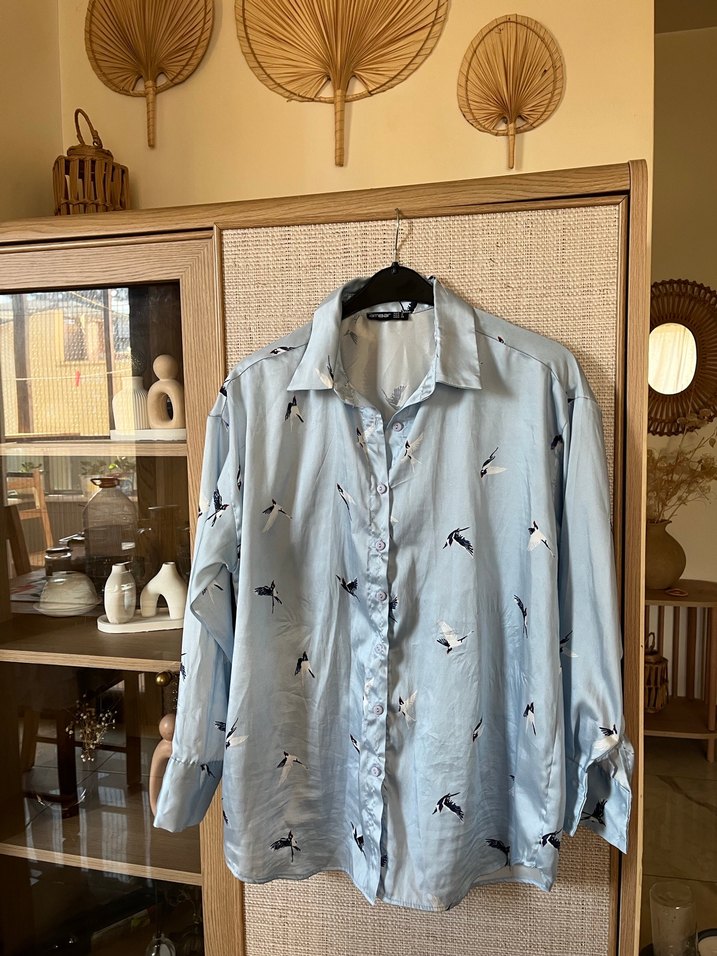 İpek dokulu, düğmeli, uzun kollu ve yakalı mavi gömlek, rahat kesimi ve baskılı deseniyle günlük kullanıma uygundur.