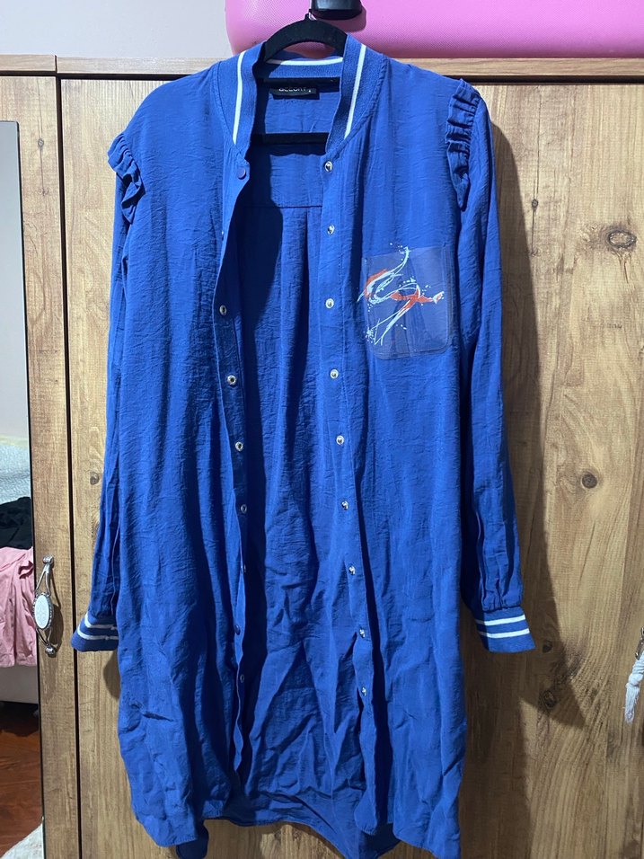 Uzun kollu, bol kesim mavi denim kadın gömleği. Düğmeli, kesik yaka ve nakışlı cep detayıyla günlük kullanıma uygun.