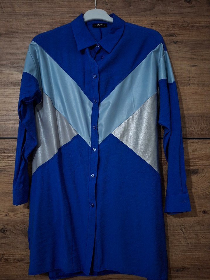 Parlak mavi renkli, uzun kollu kadın gömleği. Gümüş ve açık mavi chevron detaylı, düğmeli ve notched lapel yakalı, regular fit model.