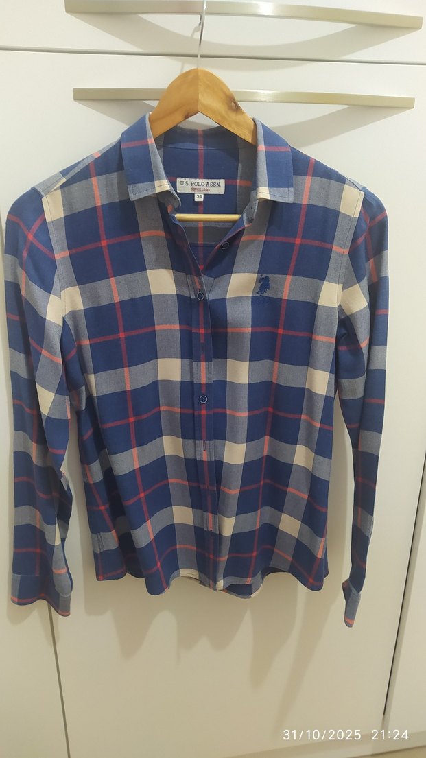 Düğmeli önü ve yakalı uzun kollu, mavi kareli baskılı gömlek. Rahat kesimi ve midi boyu günlük kullanıma uygundur.